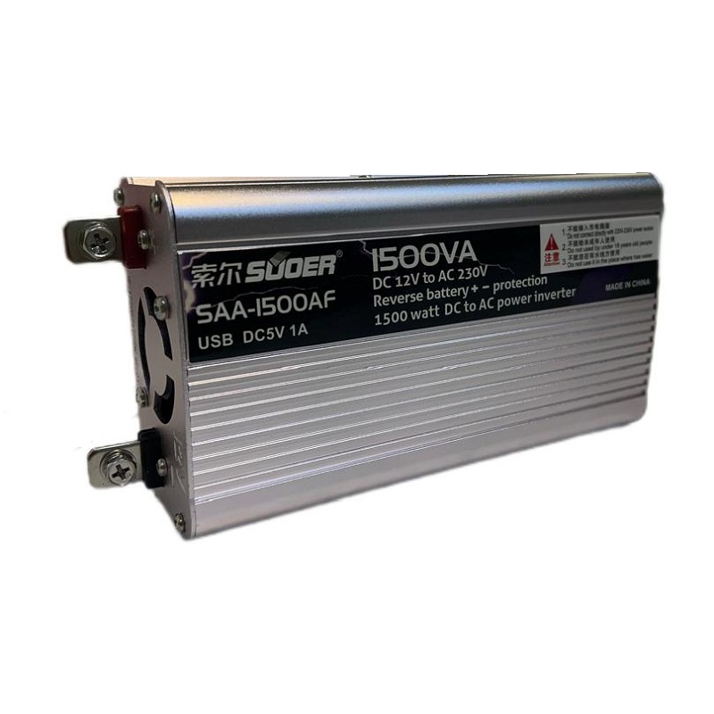 اینورتر مبدل برق خودرو 1500 وات سوئر جهت انواع دستگاه‌های برقی حداکثر توان 1500 وات استارت اولیه در پیک مصرف و 650~700 وات مصرف درازمدت، پنکه، دریل، صوتی- تصویری، تلوزیون، لامپ، لپ‌تاپ، کامپیوتر، پرینتر و مودم و.. به‌کار برده می‌شود. بدنه فلزی آلومینیومی در نقش هیت سینک خنک کننده- دارای 6 لایه آلارم محافظتی، هشداردهنده، چراغ LED، محافظ افزایش و کاهش ولتاژ، فیوز، فن هوشمند، سازگار با باتری سولار و باطری 12 ولت خودرو سواری
